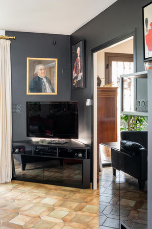 Un projet sur mesure à l’élégance contemporaine, où l’acier noir mat rencontre le verre noir brillant. La bibliothèque In-Ipso, dessinée dans un esprit industriel chic, s’accorde parfaitement avec le meuble TV assorti, intégrant avec discrétion les équipements électroniques. Le rangement latéral à la cheminée complète l’ensemble, assurant une continuité visuelle et fonctionnelle.
