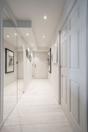 À l’entrée de l’appartement, les tons clairs des murs, du sol et des menuiseries offrent un rendu lumineux et accueillant, où la lumière naturelle circule librement et valorise chaque détail.