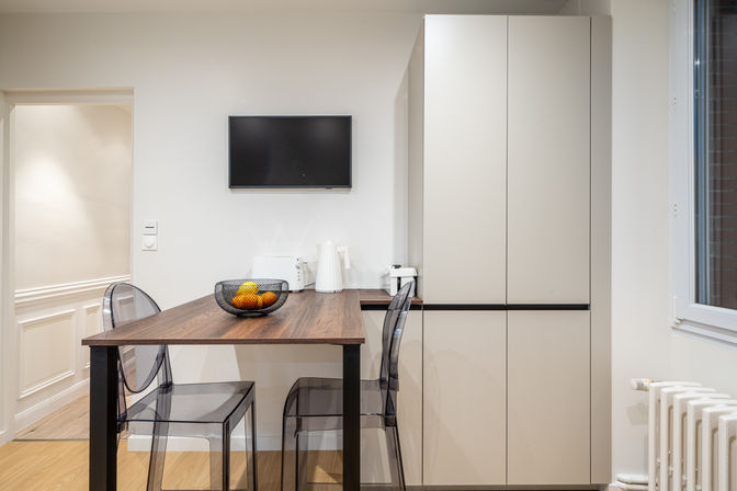 Cette rénovation met en avant un design épuré et minimaliste, où les matériaux et les teintes douces créent une atmosphère apaisante. La cuisine allie meubles mats Ballerina et plan de travail Integra, tandis que la salle de bain reste sobre et raffinée, grâce aux teintes Little Greene et aux lignes discrètes du mobilier.