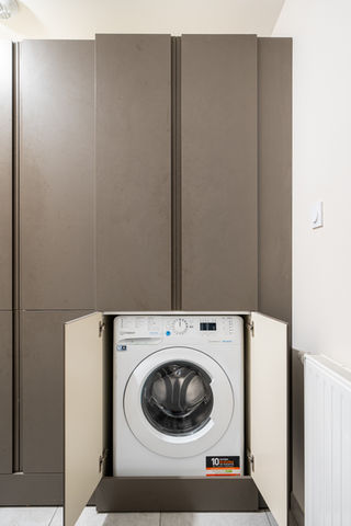 Oui, il a été conçu pour intégrer la lave-linge et sèche-linge, tout en respectant l’esthétique du reste de la maison.