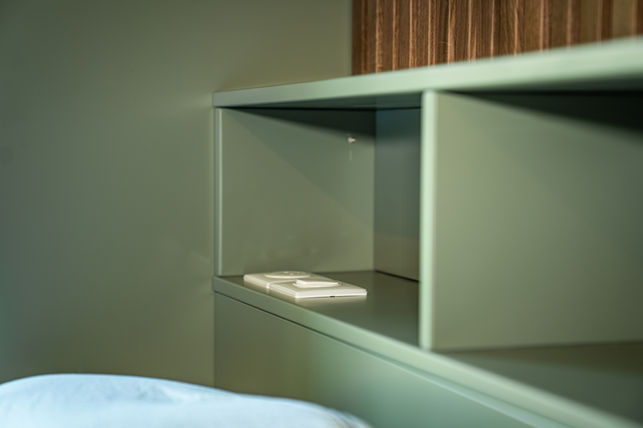 Dans la salle de bain, la contrainte d’espace a été sublimée par le choix de couleurs claires et d’un carrelage Iris aux teintes douces, apportant clarté et élégance à la pièce.