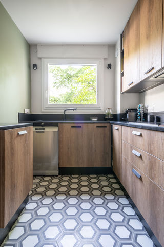 Une rénovation chaleureuse et graphique où le parquet caramel Quickstep donne le ton dès l’entrée. Le séjour est sublimé par un color zoning bleu évoquant les profondeurs marines. Dans la chambre enfant, un duo de teintes Little Greene dynamise l’espace. La cuisine en mélaminé chêne avec plan de travail en quartz noir allie modernité et résistance.