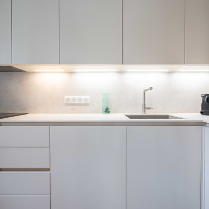 Un évier encastré et un mitigeur Bradanit complètent l’ensemble avec sobriété, tandis qu’un éclairage LED intégré sous les meubles hauts assure un confort visuel optimal, tout en conservant un design épuré.
